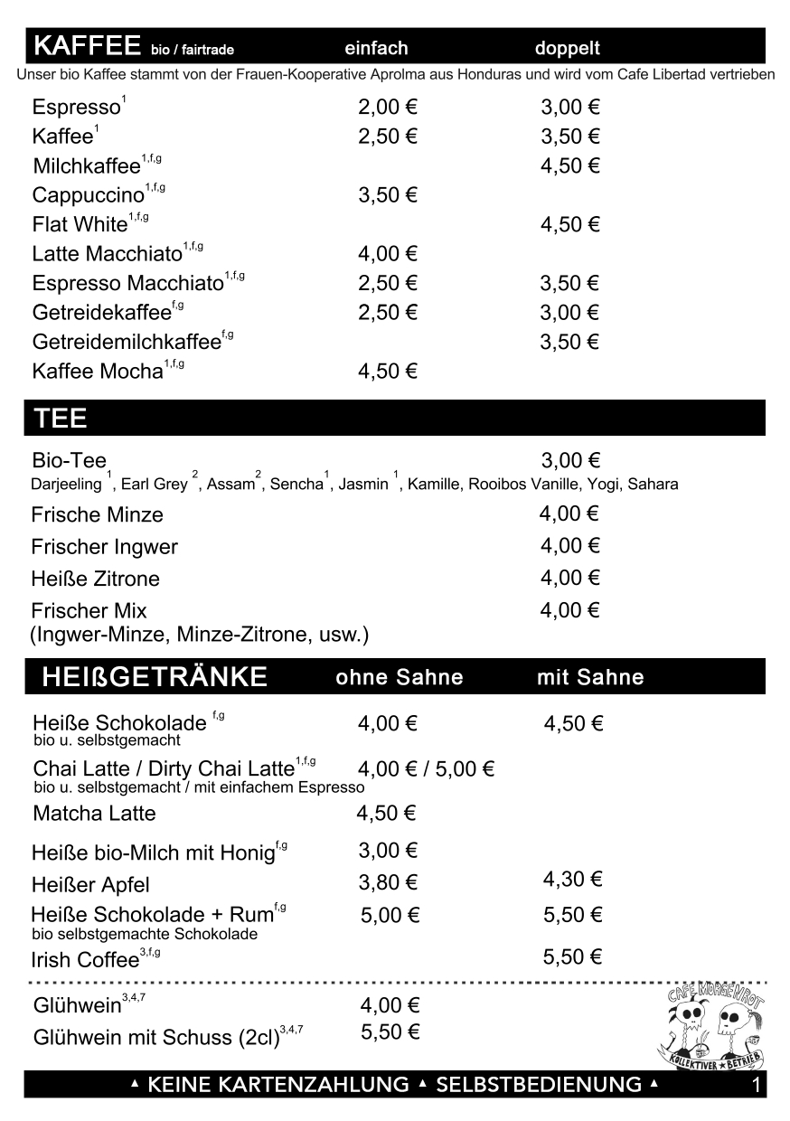 | Getreidekaffee | 2,50 € | 3,00 € |