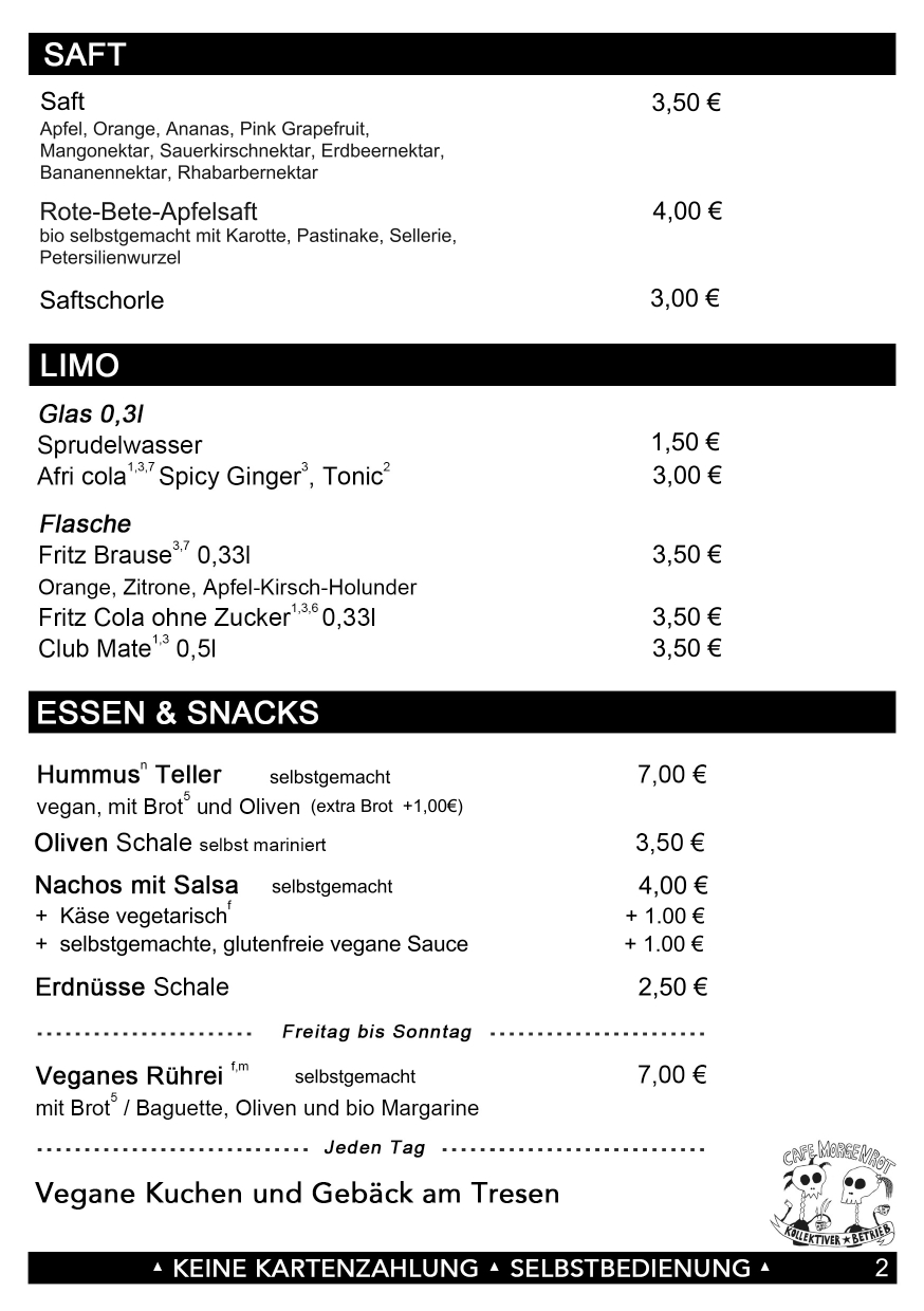 | Veganes Rührei | (nur Fr-So) mit Brot, Oliven & Bio Margarine | 7,00 € |