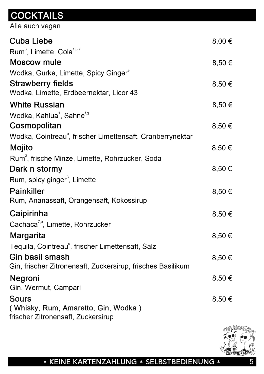 | Moscow mule | Wodka, Gurke, Limette, Spicy Ginger | 8,50 € |